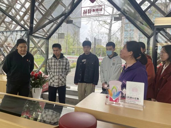 在与讲解员的互动中,支部成员通过VR技术体验滨江党建地图,了解党群服务站服务党员及群众的设立初心、发展历程,学习习近平总书记考察上海重要讲话精神,树立“作为能源电力特色高校学子,要聚焦城市治理‘最后一公里’,将专业所学融入便民服务创新”的奋斗决心。