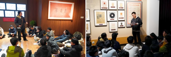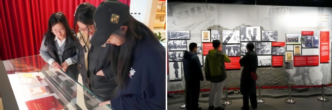 研学首站来到国歌展示馆,同学们在珍贵的历史文物与详实的文献资料前驻足沉思。一张张记录民族危亡的图片、一段段重现抗战岁月的影像,系统展现了《义勇军进行曲》从战火中诞生、在时代中传承的完整脉络,让大家深刻体悟到国歌背后蕴含的磅礴精神力量。