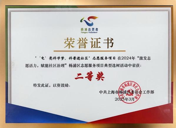 近日,在杨浦区2024年度“激发志愿活力,赋能社区治理”志愿服务项目典型选树活动中,电气工程学院“‘电’亮科学梦,科普进社区”志愿服务项目从83个参选项目中脱颖而出,荣获优秀项目二等奖。该项目充分发挥专业特色,自2018年启动以来,连续六年走进社区、中小学等,组织500余名志愿者累计开展服务200余次,辐射5000余名青少年,以电力科普为纽带,专业赋能社区治理、青少年课后服务与青少年科学素养提升等,用“电娃”小课堂为青少年托起成长“大平安”,获评2024年团中央“七彩假期”关爱行动志愿服务团、上海市青年志愿服务典型案例。