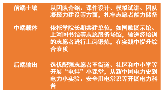 健全制度规范管理,打造综合素质过硬的志愿者队伍。项目注重志愿者队伍建设,组建“树状讲解团”,以“四心”实现梯队化建设,即坚定红心锻素质、坚固重心强专业、坚守初心为成长、坚秉恒心送服务。项目形成“1+1+X”的管理模式,即1项志愿者管理制度,1个志愿者数据库及X个服务对象,聚焦“人人参与”做志愿,聚焦“学生需求”提服务,聚焦“电力特色”讲知识,规范岗前培训,严抓课程内容,丰富课程形式,强化课程效果,完善激励保障,打造以“前端土壤-中端载体-后端输出”为链条的志愿者培养体系,激发志愿者们的服务热情和内生动力。