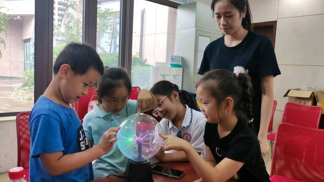 第二部分,志愿者们通过等离子球、特斯拉电圈等实验设备的演示,寓教于乐,展示电的千姿百态。小朋友们在志愿者的鼓励下勇敢尝试,让原本看不见的电能,在手掌上跳起了舞,也体验到了静电感应起电器的魅力,小朋友们玩得不亦乐乎;