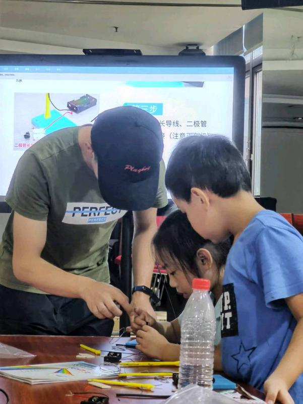 第三部分,在志愿者的悉心指导下,小朋友们独立完成了看似困难的“创越火线”的模型搭建,电路原理的讲解使小朋友们对简单的串联电路有了初步的认识!该实验设备有利于培养小朋友的耐心和专注力。小朋友们跟着志愿者一步一步完成,将复杂的结构简单化,面对困难的步骤也不放弃,询问老师和好朋友,在大家的不懈努力下,最终完成了搭建。小朋友对这个会发光、会发声的“新玩具”充满了好奇,爱不释手。