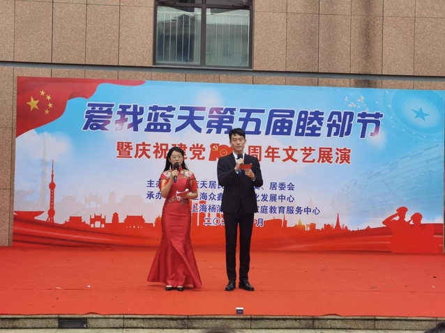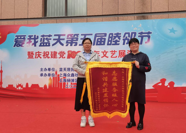 10月16日,蒙蒙细雨抵挡不住蓝天居民区军民载歌载舞、欢聚一堂的热情,一场由社区居民自编、自导、自演的“爱我蓝天”第五届睦邻节如期上演。演职人员由现役军人、退役军人、军属、大学生志愿者共同组成,活动既丰富了居民的精神文化生活,又增强了居民的幸福感和归属感,展现了党建引领下共建共治共享的社区发展新面貌。电气工程学院学生代表张启胜和周育昕前往蓝天社区主持五角场街道蓝天居民区“爱我蓝天第五届睦邻节”文艺演出。电气工程学院本科生第一党支部书记余开华参与授旗仪式,领取锦旗。