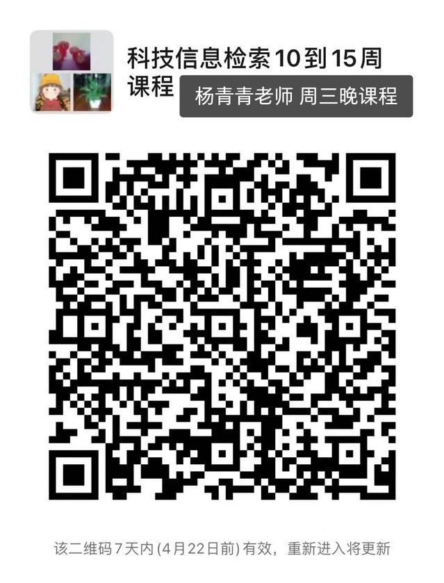 1.图书馆杨青青老师 第10-15周 周三晚 《科技信息检索》选修课