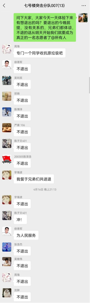 为了减小同学出寝而带来的人员交叉聚集的风险,突击队成员一经确立后无特殊情况就不得再更换成员,所以有必要给大家做好思想准备。纵然第一天大家体验下来,已经知道这将是十分艰辛的工作,不仅时间和体力消耗巨大,有时穿上防护服也不能方便上厕所,但在队长程卓询问大家是否有人想退出的时候,大家都异口同声的说道:“不退出!”。在那一刻,队长知道,这支队伍将能克服所有困难,顺利完成此次学校交代的任务。