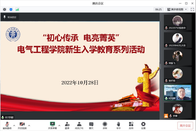 10月28日下午,电气工程学院“初心传承·电亮菁英”菁英班新生入学教育系列活动之班风学风建设会议在腾讯会议线上展开。学院党委副书记、2022级菁英班班主任叶华刚,2018级菁英班班长姚振飞,2021级菁英班团支书杨铮及全体菁英班同学参加,辅导员罗黛主持会议。