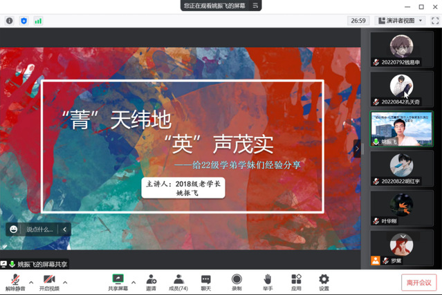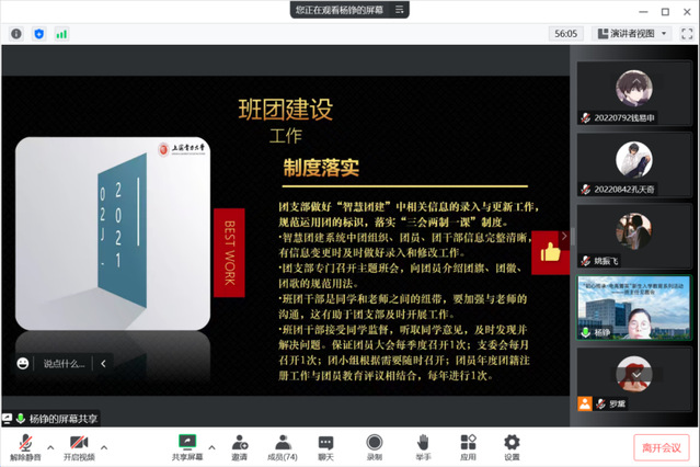接着,2021级菁英班团支书杨铮应邀介绍了菁英班班团建设的情况,介绍了2021级菁英班开展的各类活动及抓好班级凝聚力建设的工作做法,为2022级菁英班班团工作起好步提供了启示。