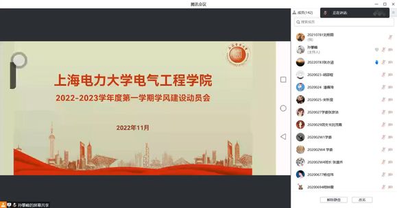 为更好地推进学院学风建设,落实本学年各项学风工作要求,结合本学期疫情常态化防控下线上教学实际情况,11月2日,电气工程学院召开2022学年第一学期学风建设动员会。学院党委副书记叶华刚、学风建设专项负责人孙攀峰、各年级辅导员及各班级学习委员主要班干部等160余人通过线上腾讯参加会议。会议由孙攀峰主持。