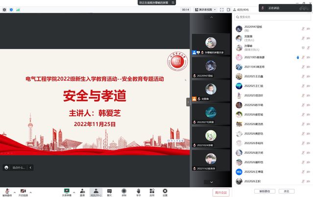 2022年11月25日,电气工程学院举办了2022级新生入学教育安全专题线上讲座“安全与孝道”,活动特邀国网河南省电力公司经济技术研究院教授级高工韩爱芝老师主讲,学院党委书记赵玲、2022级新生辅导员、全体2022级新生参加了本次讲座活动,讲座由学院2022级新生辅导员罗黛主持。