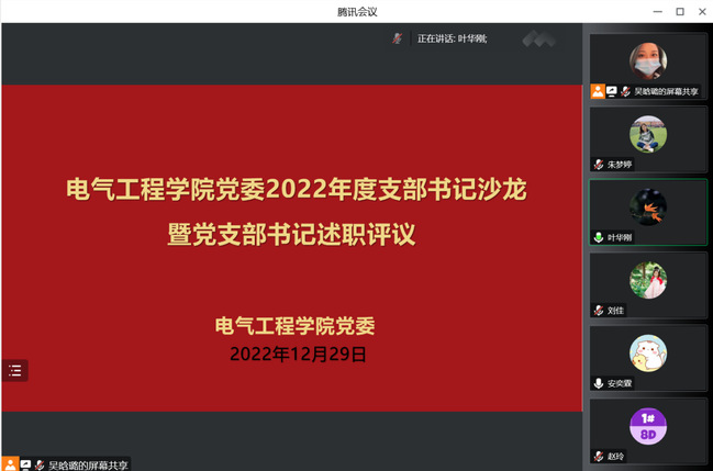 为深入学习贯彻党的二十大精神和习近平新时代中国特色社会主义思想,贯彻落实校党委工作部署,切实激发基层党支部书记履职尽责的动力,夯实基层党组织的战斗堡垒作用,近日,电气工程学院党委召开2022年度支部书记沙龙暨党支部书记述职评议会。学院党委班子成员、组织员、党支部书记参加会议,离退休党委组织员刘佳列席会议。会议由学院党委副书记叶华刚主持。