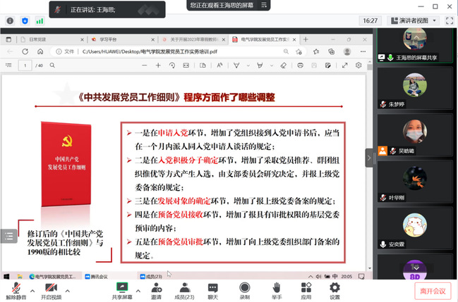 会议伊始,学院党委组织员王海思就《中共发展的党员工作细则》等内容进行专题分享,就今年学院党员发展工作中的重点、难点问题进行交流和总结,要求各党支部要在党员培养考察教育的各个环节进一步从严要求,并做好日常管理和记录整理工作。