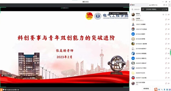 为营造浓厚科创氛围,切实提升大学生创新创业能力,2月23日,电气工程学院在杨浦校区行政楼举办创新创业大讲堂暨双创指导老师聘任仪式,校外指导老师张庭赫、学院党委副书记叶华刚、学院实验中心主任刘建锋、学院团委书记刘紫薇、辅导员芮超、科创指导老师及对科创感兴趣的同学等线上线下共600余人参会。会议由学院辅导员曲家瑶主持。
