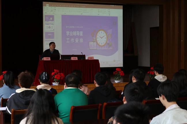 为推进新学期学院学风建设工作,营造严谨踏实、奋发向上的学习氛围和良好的学习环境,3月8日电气工程学院召开2023年春季学期学风工作推进会暨学业辅导室新一届学生干部授聘仪式。学院党委副书记叶华刚、学风建设专项负责人孙攀峰、新一届学业辅导室成员及学院2020级、2021级班长、团支书及学习委员等一百余人在杨浦校区小礼堂参会。会议由学业辅导室主任代舒玮主持。