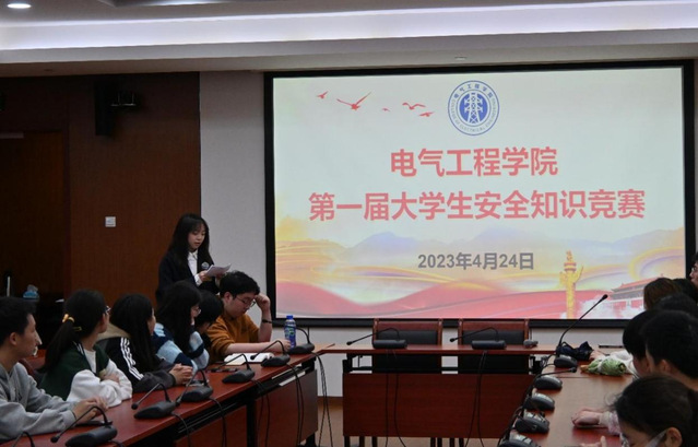 为响应国家安全月号召,提升学院学生安全防范意识,创新安全教育形式。电气工程学院第一届大学生安全知识竞赛于4月24日晚在临港校区学术楼301举办,电气工程学院安全专项辅导员郭超磊,各参赛队伍共同参与。
