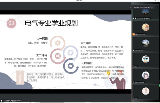 为推进电气工程学院学风建设,帮助同学掌握正确学习方法,了解专业学习规划,积极备战四六级和研究生考试,电气工程学院学业辅导室于5月11日和5月17日分别召开了“四六级及学习规划”学业沙龙和“考研分享”两次学业沙龙活动。两次学业沙龙主讲人均为学业辅导室共建单位研究生第七党支部的研究生党员,学业辅导室何晏雯、芦俊煒分别主持了两次活动,电气工程学院2020级、2021级、2022级近百名同学参加了活动。