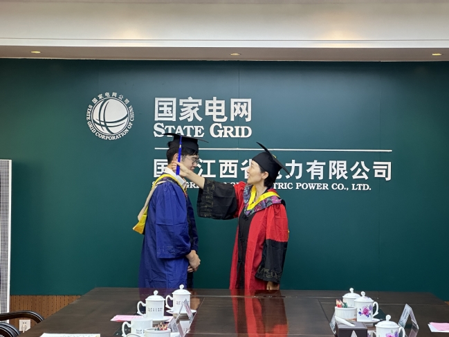 6月16日上午,黄冬梅副校长一行在国家电网江西省电力有限公司调研期间,亲切接见在赣校友,并为一位2022届硕士毕业校友举行一场特殊的“拨穗礼”。