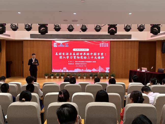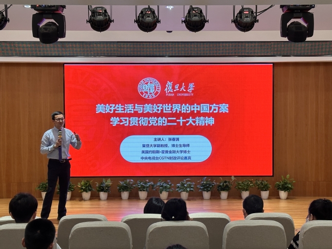 活动伊始,复旦大学马克思主义学院张春满副教授作《美好生活与美好世界的中国方案:深入学习贯彻党的二十大精神》红色文化大讲堂党课。张春满以老百姓简单过日子到享受美好生活为开篇,紧扣建设美好生活和美好世界这一主题主线,重点讲解党的二十大报告中的构建新发展格局、党的建设和中国特色大国外交三个方面的内容,从内政外交两个维度展现新时代伟大变革的深刻内涵和重大意义,从国内国际两重视野把握中国式现代化的中国特色、本质要求和重大原则,展现习近平新时代中国特色社会主义思想的世界观、方法论,为全面学习、全面把握、全面落实党的二十大精神提供理论支撑和实践指引。