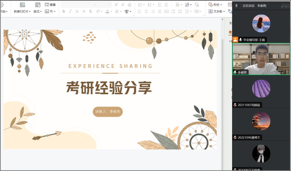 本次沙龙活动,学院邀请了李春煦和吴晗两位研究生党员、新聘朋辈导师为本科生分享了英语四六级考试和考研两方面经验。博士研究生李春煦同学详细讲解了考研的流程和注意事项,并分享了自己的经历和备考感悟,激励广大考研同学认真学习,不断完善和提升自我;硕士研究生吴晗同学针对考研初试和复试的具体科目和择校问题等进行了整体性介绍,并给出一些建设性意见,同时针对如何在考研备考中调整心态、如何备考四六级考试等问题进行了答疑解惑,并分享了一些实用的方法和技巧。