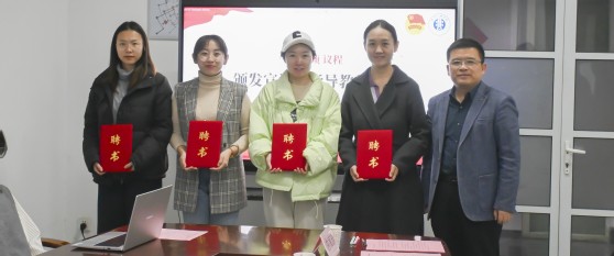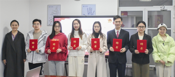 叶华刚为宣讲团指导教师代表颁发聘书。刘紫薇、安奕霖为上电电气“薪火”大学生理论宣讲团成员颁发聘书。