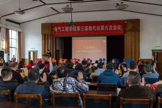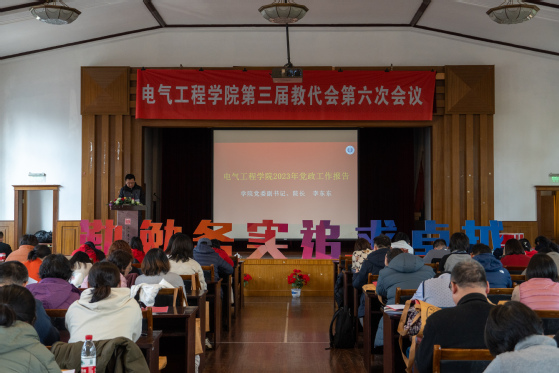 大会在庄严的国歌声中拉开帷幕。会议听取了学院党委副书记、院长李东东所作2023年党政工作报告。工作报告详细总结了学院2023年在基层党建、学科建设、师资队伍、教学科研、人才培养及国际交流等方面的工作,实现了电气工程学科教师团队入选全国第三批黄大年式教师团队、获批上海市Ⅲ类高峰学科、电气工程博士后科研流动站获批新设及“挑战杯”国家一等奖等新的突破,推动了学院事业高质量发展。同时分析了学院发展的机遇与挑战,并对2024年工作进行了展望。李东东在报告中号召学院全体教师深入学习贯彻习近平新时代中国特色社会主义思想,以校党委“六新”理念为引领,聚焦高质量发展关键问题,以踔厉奋发、笃行不怠的精神和众志成城、攻坚克难的意志奋力续写学院发展新华章!