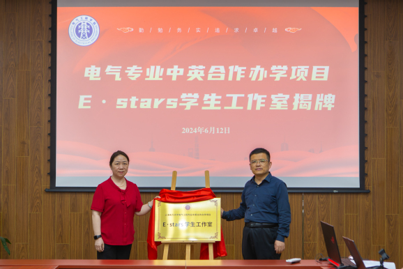 曾芬钰、叶华刚为电气工程学院中英合作办学项目E·stars学生工作室揭牌。工作室的成立将进一步加深同学们对合作办学项目的理解,为怀有出国留学梦想的学子们搭建获取专业指导与实践路径的平台,为学院与合办学生建立沟通的桥梁,更好地服务和促进合作办学大学生发展。