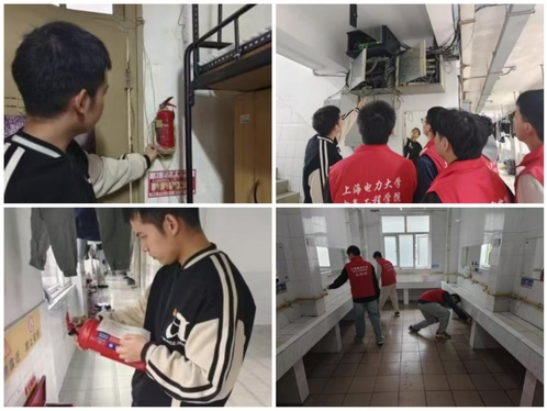 结束座谈,男生党员和入党积极分子们在杨浦校区4号宿舍楼身着统一的志愿者服装,深入宿舍楼公共区域,手持清洁工具,为宿舍楼内的同学们提供一次贴心的“暖心服务”。他们帮助同学们清理无人处置的楼道垃圾、检查漏水龙头等,用实际行动传递着党组织的关怀与温暖。在打扫卫生的同时,检查了消防器械和违规私拉电线情况,向同学们宣传用电安全知识,提醒他们注意宿舍用电安全,避免使用违规电器,确保宿舍生活的安全稳定。