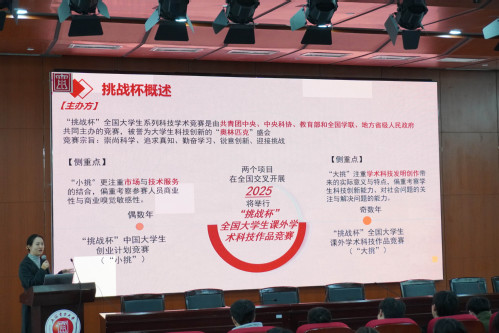崔颖聚焦即将到来的2025年“大挑”,从赛事分类、参赛组别、选题来源、论文及说明书的撰写、时间安排等方面进行了详细的解读,简要介绍了各类赛道的优秀代表作品,以榜样的力量激励同学们奋勇争先。